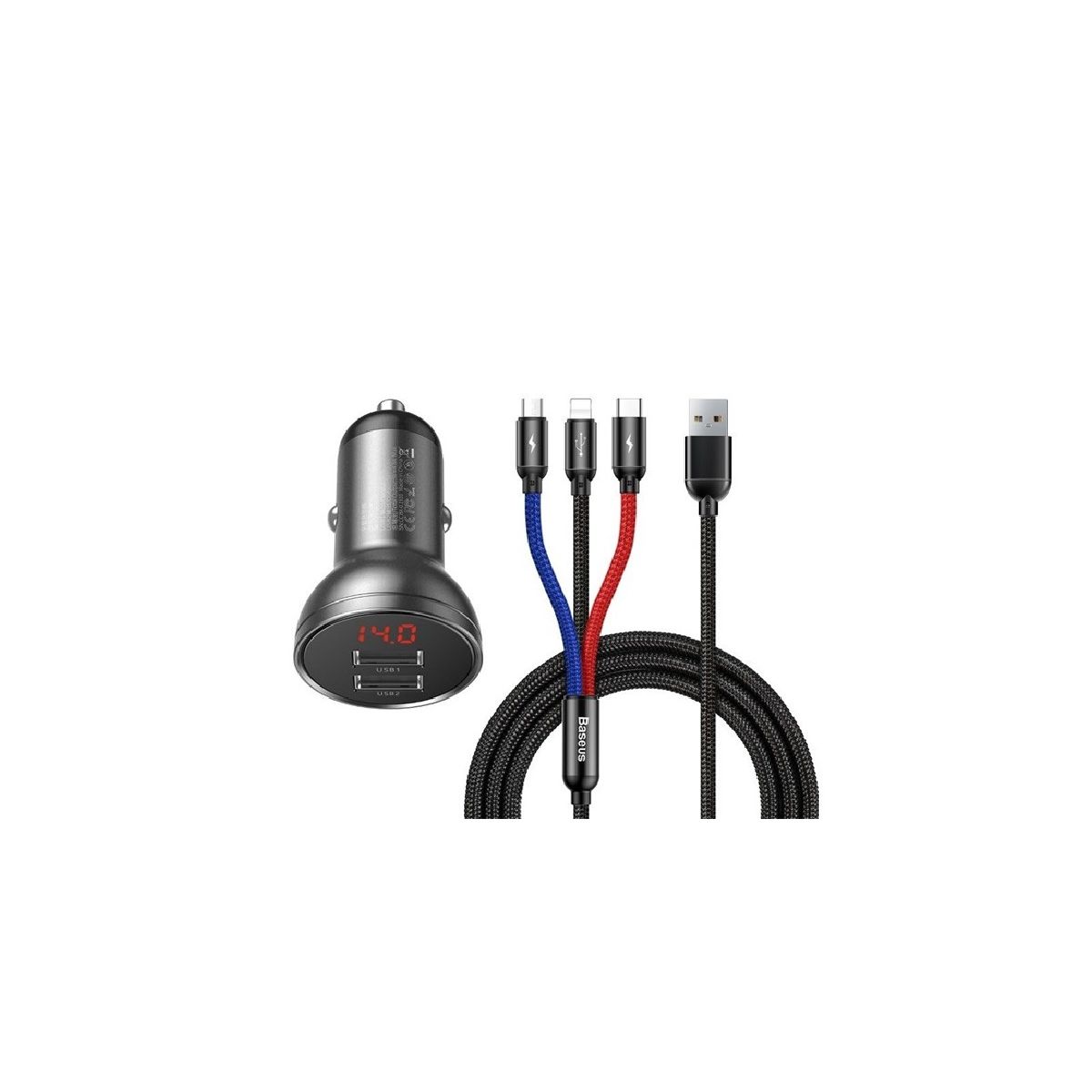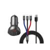BASEUS autós töltő 2 USB aljzat (24W, LED kijelző + lightning/microUSB/Type-C kábel) SZÜRKE