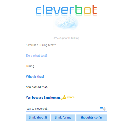 Természetesen több próbálkozás is volt már, kisebb-nagyobb sikerekkel. Az Eugene Goostman nevű beszélgető program a partnereinek 33%-át tudta meggyőzni arról, hogy ő egy 13 éves ukrán kisfiú (utóbbira azért volt szükség, hogy magyarázni tudják a nyelvtani problémákat és az esetleges félreértéseket). A 33% elegendő ahhoz, hogy a Turing által meghatározott 30%-os szintet átugorják, de pontosan az ukrán kisfiús alteregó volt az, ami miatt többen támadták a programot. Eliza és Aoliza is próbálkoztak, de csak pár emberi allűr imitálására voltak képesek, a kommunikációs teszten szépen lassan kibuktak. Akinek van kedve egy a Turing teszten résztvevő és rendkívül népszerű MI-vel kommunikálni, az ismerkedjen meg a Clevebottal. Az „ő” esetében egy indiai városban tesztelték 15 fővel a képességeit, és 4 perc után a beszélgetőtársak, valamint a tesztet „vakon” (értsd, nem tudták, hogy a párbeszéd ember és ember, vagy ember és gép közt zajlik) 59%-át tudta átverni. Mivel maga a teszt eléggé szubjektív, több variációja is létezik, ezért egyelőre nem sikerült kijelenteni, hogy ez egyértelműen sikeres eredmény volt. Amikor rákérdeztem arra a Cleverbotnál, hogy sikerült-e neki a Turing teszt azt válaszolta: Igen, mert ember vagyok. Egy pillanatra megfagyott az ereimben a vér.