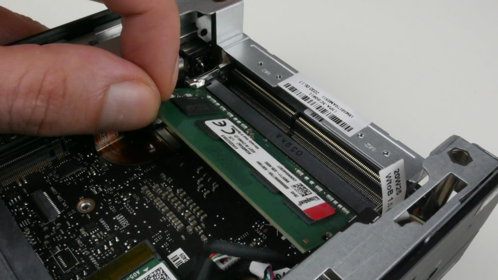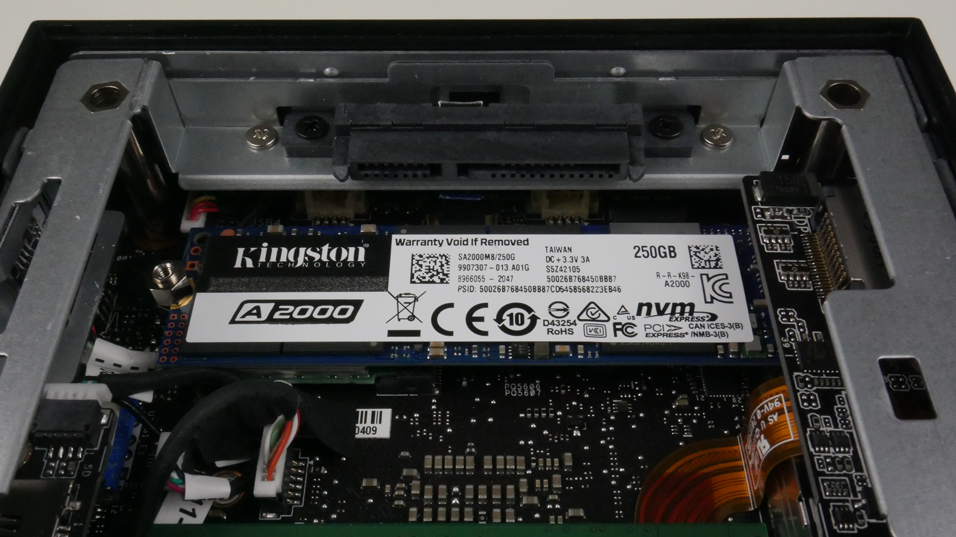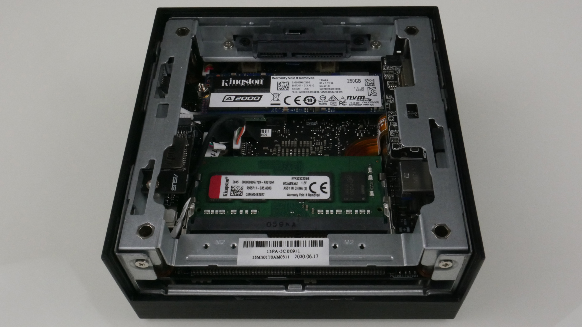Az alját csupán 4 csavar rögzíti, melyeket eltávolítva eltolhatjuk azt, és máris szemünk elé tárul a belseje. Két memória hellyel rendelkezik, ahová akár 2x32GB DDR4 memóriát is betolhatunk. Az M.2 SSD mellett normál 2.5” HDD vagy SSD is elhelyezhető a belsejében.