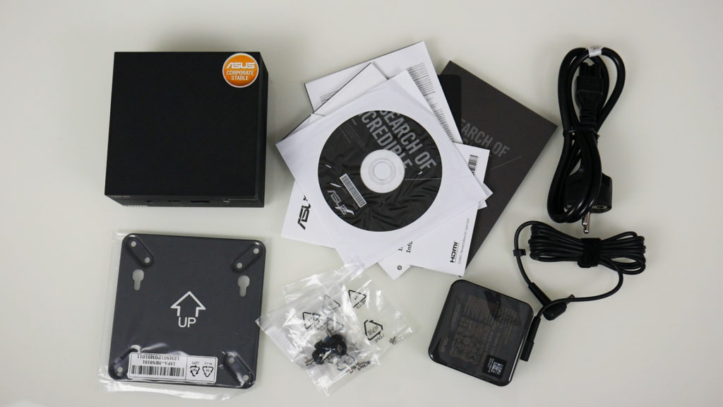 A dobozban maga a mini PC, amit először megpillantunk, majd egy külön fakkban a kézikönyvei, CD, különböző csavarok, tápkábel és adapter, valamint egy VESA szabványos monitor hátuljához való rögzítésre szolgáló fém dokkoló található.