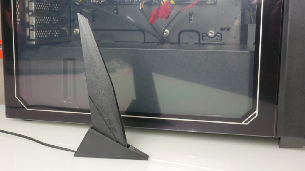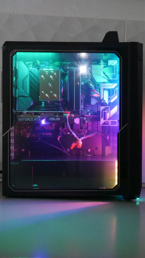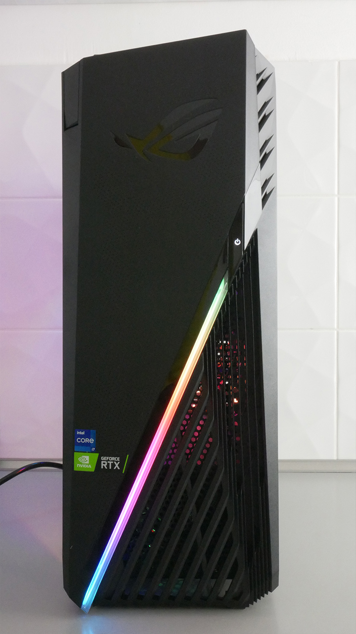 Szemből egy menő RGB csík megy keresztbe, és itt található a bekapcsoló gomb. A LED csík alatt a szellőző rács található, felette pedig tömör kialakítás és a Republic of Gamers logó.