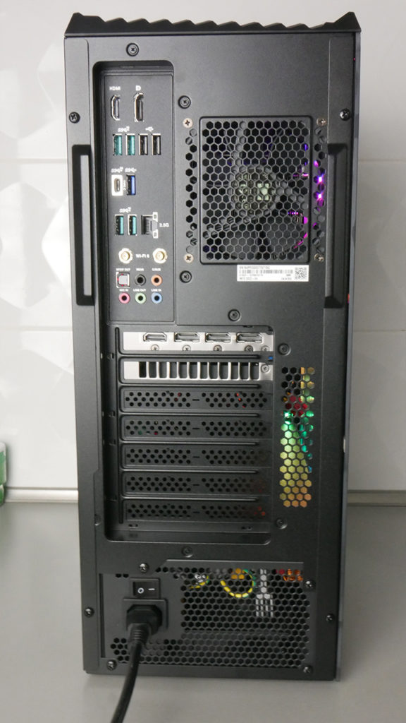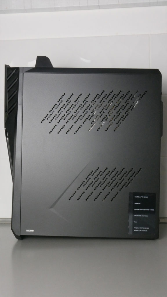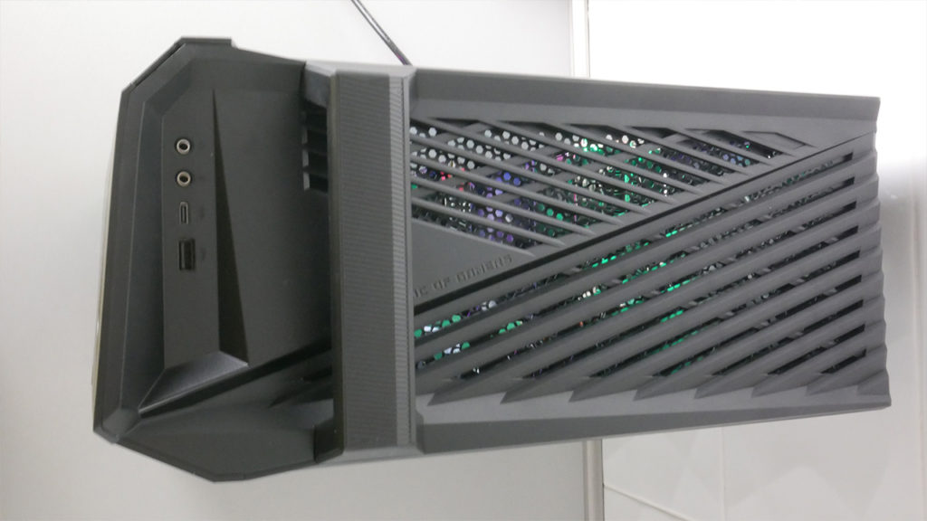 Tetején rácsos kialakítás, a szállító fül előtt 1 db USB 3.0 port, 1 db USB Type-C és a vezetékes fülesekhez 3,5 mm jack kimenet és mikrofon bemenet található. A jobb oldalán szintén szellőzéssel turbózott fém lap, míg jobb oldala teljesen üveg, így beláthatunk a belsejébe és a belső LED megvilágítást megcsodálhatjuk.