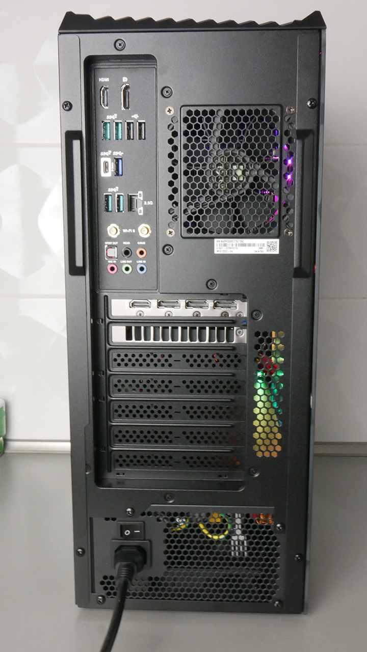 Az alaplap egy ASUS GA15CF, ami külön nem kapható, kifejezetten ehhez a gamer PC-hez készült és Intel B660-as chipset-tel rendelkezik. Van rajta integrált VGA, de azt kb. soha nem fogjuk használni, hiszen sokkal komolyabb videóvezérlő lapul a gép belsejében. A portok sorban: egy HDMI és egy Displayport az integrált VGA-hoz. Alatta az USB portok, melyekből van 2 db USB 3.1 és 5 db USB 3.0, valamint 1 db USB Type-C 3.0. Az ethernet csatlakozó 2,5 Gigabites. A következő 2 csatlakozó a külső Wi-Fi antenna csatlakoztatására szolgálnak. Alatta optikai kimenet és a Realtek ALC887 audio vezérlő ki- és bemenetei.