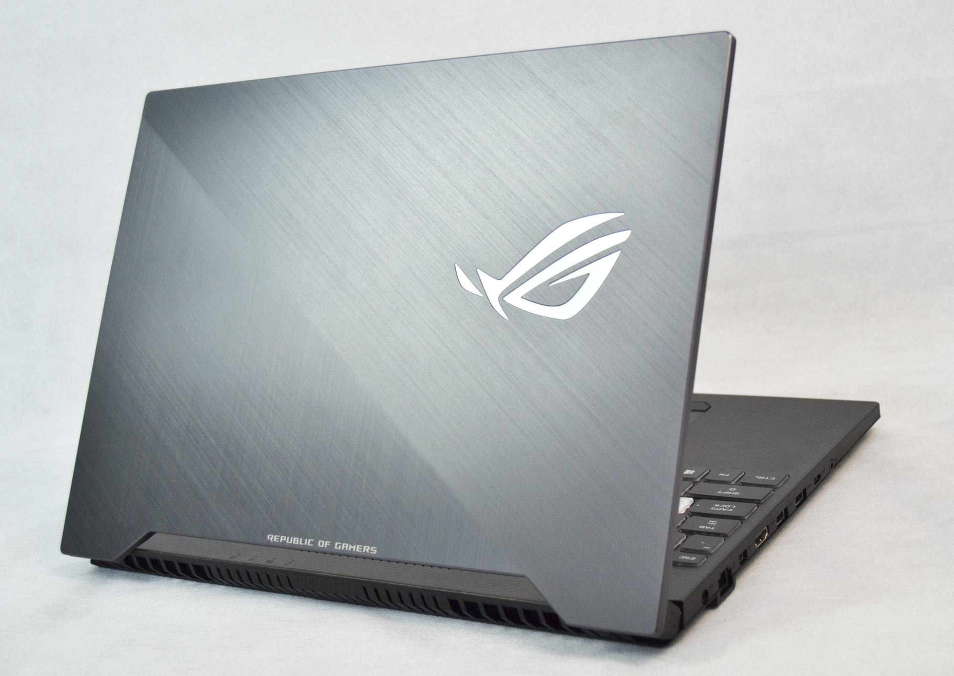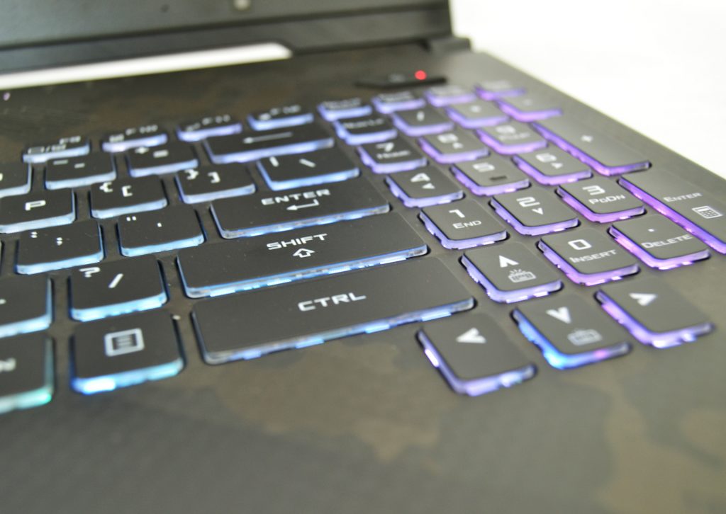 A bevezetőm tulajdonképpen már itt értelmét nyeri, hiszen a feltűnőségért nem kell a szomszédba mennie a GL504G-nek. Fogták ismét a Zephyrus formavilágát és kisebb-nagyobb változtatásokkal, de átemelték a G-széria ezen kiadásába. Szögletesség a köbön, a csiszolt fedlapról ugyan a bemélyedés elmaradt, de nekem nem is igazán hiányzik, a két szélen lévő zsanér közötti űr viszont megmaradt, ismét helyet adva az állapotjelző LED-sornak. Tapintásra rendkívül finom fém felületen egy ROG-logó is helyet kapott, ami a megfelelő ROG Aura beállításokkal a nekünk tetsző színben tud világítani/pulzálni/színt váltogatni. Ez úgy egy- az-egyben elmondható a teljes billentyűzetre is, ugyanis oda is egy RGB háttérvilágítás került, így az 1.8 mm-es billentyűúttal dolgozó tasztatúrát is a nekünk tetsző diszkó-effektussal öltöztethetjük fel. Ha már a billentyűknél tartunk, a WASD igen izgalmas kiemelést kapott, hiszen ezúttal nem a festésével babráltak, hanem a komplett billentyűt áttetsző műanyagból építették be. Így világítás nélkül láthatjuk a lenyomásokért felelős, membrános szerkezetet. Kaptunk természetesen kiemelt gombot a ROG-Centernek, na meg a hangerőszabályozásnak, valamint a nyílbillentyűket is igyekeztek úgy elhelyezni, hogy egy kicsit kiemelkedjenek a nagy egészből. A billentyűzet környékén járkálva feltűnhet, hogy a 80-as évek akciófilmjei is bőven jelen lehetnének a gép életében, hiszen az, hogy Schwarzenegger a Predatorral küzdött az erdőben és Stallone, Ramboként irtotta a kelet-ázsiai hadseregben szolgálókat, megihlette az ASUS dizájnereit, akik egy kis kamuflázst varázsoltak a gépre. Agresszív forma, sok villogó, színes fény és kamuflázs… aki ezek után sem biztos abban, hogy milyen gépet lát maga előtt, azon már csak a lentebb olvasható teljesítményblokk segíthet. A külsőségekhez természetesen még hozzátartoznak a gép méretei és súlya is: a GL504G 36.1 x 26.2 x 2.61 cm-es dimenziókkal és 2.4kg-es mérlegeléssel szál versenybe a gamerek kegyeiért, amivel hozza a 15 inches kijelzővel rendelkező gépek nagy átlagát. Ha már kijelző, említsük meg még a külsőségeknél, hogy itt is, a trendeknek megfelelően igyekeztek a legvékonyabb kávát létrehozni a kijelző körül, ami be is jött: oldalt és felül vékony keret, míg alul egy vastagabb elem, egy nagy ROG-logóval dekorálva.