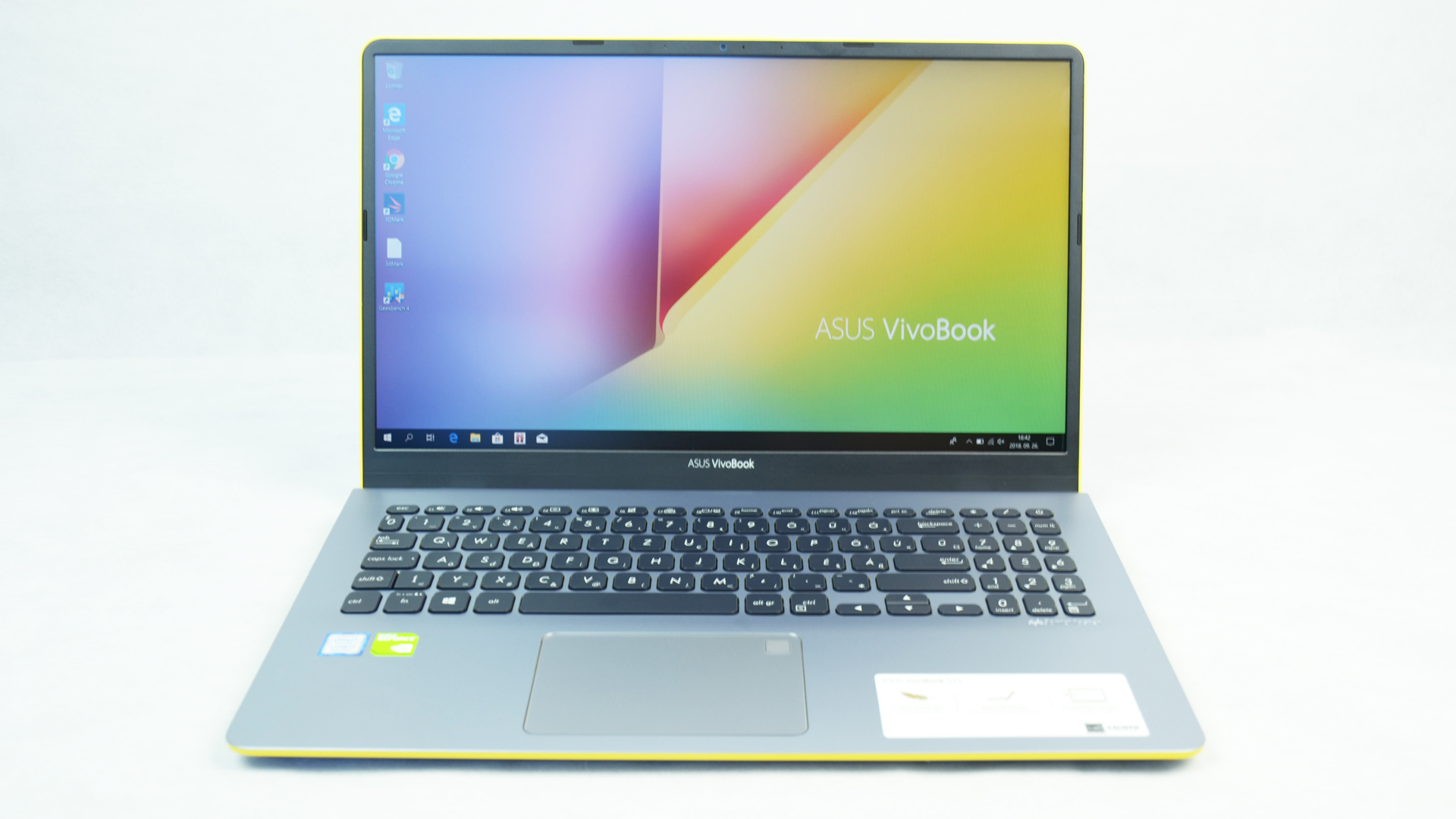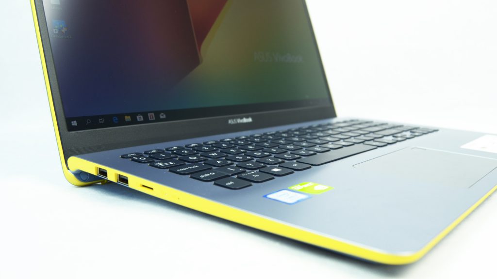 Az ember fia/lánya, ha office gépet választ magának, akkor egy elég szűk térben mozoghat, a dizájn tekintetében. Van az iszonyú egyszerű, fémes/matt dizájnú tábor, illetve a „luxusprémium” érzetűek csoportja, amiből válogathatunk. Az egyediséget viszont egy idő után mindegyik hanyagolni kezdte. Nem voltak kirívó, vagy bátor dizájnbeli döntések, egészen mostanáig. Az ASUS a Vivobook szériájánál elengedte dizájnerei kezét és azt mondta nekik: legyen fiatalos és divatos. A csiszolt fém bevonatot feldobták a tesztgépünk esetében egy sárga dekorcsíkkal, ami annyira elüt az alap dizájntól, hogy egy érdekes hatást váltson ki: elsőre furán néztem rá, majd a megszokással és a több használattal egyre jobban megtetszett. Méreteit tekintve, egy 361 x 143 x 18 mm-es notebookot kapunk, amiben ugye főleg a vékonysága a legizgalmasabb. Ehhez a vékony testhez, pehelysúly is tartozik, hiszen 1.8 kg súlyával, tényleg a „cingár” darabok közé tartozik a 15.6 inchesek palettáján. Egy pár szót még a kijelzőről, ha már előjött: egy NanoEdge megoldásos elemről beszélünk, tehát a felső és oldalsó kávák mérete rendkívül vékony, ezzel elérve a 86%-os képernyő/ház arányt. Az alsó panel ettől egy fokkal „unalmasabb” lenne első pillantásra, hiszen a lekerekített szélekkel rendelkező billentyűzet, a standard fehér háttérvilágítással és a vékony, fémes dekorcsíkkal ellátott touchpaddal elég hétköznapi is. Ezt viszont megspékelték az enyhén hajlított kialakításával, ami egy erősítőt hordoz magában, valamint a touchpad jobb felső sarkába rejtett ujjlenyomat olvasóval. Érdekes megfigyelni, hogy az office gépeken egyre elterjedtebb ez a megoldás, számítva arra, hogy az ember a „fél életét” ezeken a gépeken tárolja. A gép alján két hangszóró, valamint 4 csúszásgátlós talpacska kapott helyet, a bemutató túránk így folytatódhat a portokkal és a kijelzővel.