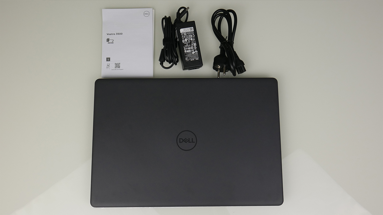 A Dell Vostro 15 3500 egyszerű kartondobozban érkezik, semmi felesleges sallang. A doboz a notebookot, használati utasítást és a töltő adaptert tartalmazza a tápkábel társaságában.