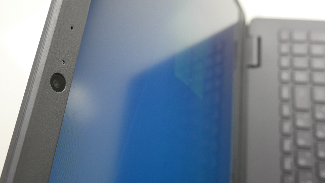Kinyitva a matt 15,6” FullHD LCD panel fogad minket, oldalán keskeny kávákkal. A felső kávában található a beépített HD webkamera és a mikrofon, valamint a kamera működését visszajelző LED.