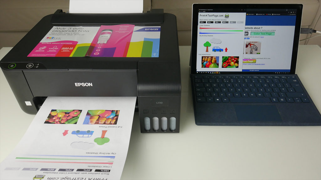 A legegyszerűbb az EPSON EcoTank L1110, mert nem multifunkciós és nincs benne WiFi sem. Epson Micro Piezon nyomtatófejjel dolgozik és 5.760 x 1.440 dpi felbontásra képes. Normál papírra a nyomtatási sebessége 33 lap/perc monokróm és 15 lap/perc színes, 10×15-ös fotópapírra pedig 69 másodperc fotónként. Kétoldalas nyomtatásra manuálisan képes, tehát nekünk kell a papírt majd megfordítani. A papírtálcán 100 lap fér el és a kiadó papírtálca kapacitása 30 lap. Csatlakozás csak és kizárólag vezetéken, USB kábelen lehetséges. A mellékelt tintapalackok 8.100 monokróm oldal és 6.500 színes oldal nyomtatására elegendők. Elsősorban otthoni és kisebb irodai feladatokra ajánlott.