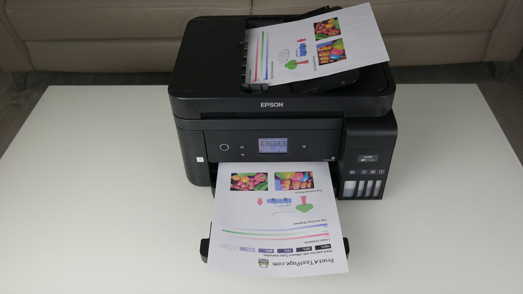 A harmadik nyomtató viszont lényegesen más, mint az első kettő, ugyanis profi irodai munkára tervezték nagyobb igénybevétellel. Az EPSON EcoTank L6190-be másfajta a tinta is, valamint egy PrecisionCore nyomtatófejet alkalmaztak esetében, a nyomtatási felbontása pedig 4800×1200 dpi. Természetesen az USB csatlakozás mellett Ethernet és WiFi képes, de WiFi direkt is rendelkezésre áll, akár közvetlenül nyomtathatunk rá egy tabletről vagy okostelefonról is. Ami pedig még inkább kiemeli a többi eszköz közül, hogy egy érintőképernyős LCD kijelzővel vértezték fel, amelyen könnyen navigálhatunk a funkciói között, legyen az nyomtatás, szkennelés, másolás vagy akár faxolás, de a wifi hálózatra csatlakozást is könnyedén elvégezhetjük itt.