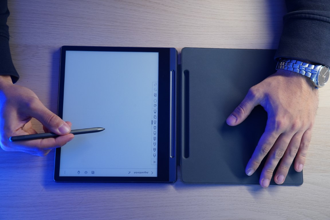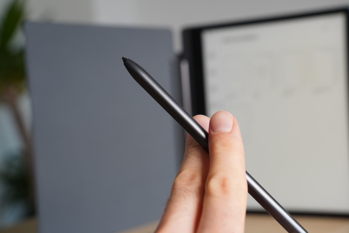 A Lenovo Smart Paper méretarányai eltérnek a megszokott tabletekétől, ugyanis a bal szélén egy markánsabb duplakeret található. A 10,3” E-Ink kijelzőn körbe fekete keretet látunk, ez bal oldalon kb. háromszorosa a többi élhez hasonlítva és annak harmada egy fémkeret, kis süllyesztett, hosszúkás mélyedéssel. Elsőre furcsa lehet, de igencsak meg van ennek az oka és előnye. Elsősorban, ha kézben tartjuk, sokkal kényelmesebb, határozottabb fogást biztosít a nagyobb keret, akár jobb- vagy balkezesek vagyunk. Továbbá az extra fémes keretben a mélyedés mágneses, mely a tollat hivatott megtartani. A tok pedig úgy lett kialakítva, hogy azt a kijelzőre hajtva, – a stílus tokon is kialakított mélyedésbe kerüljön.