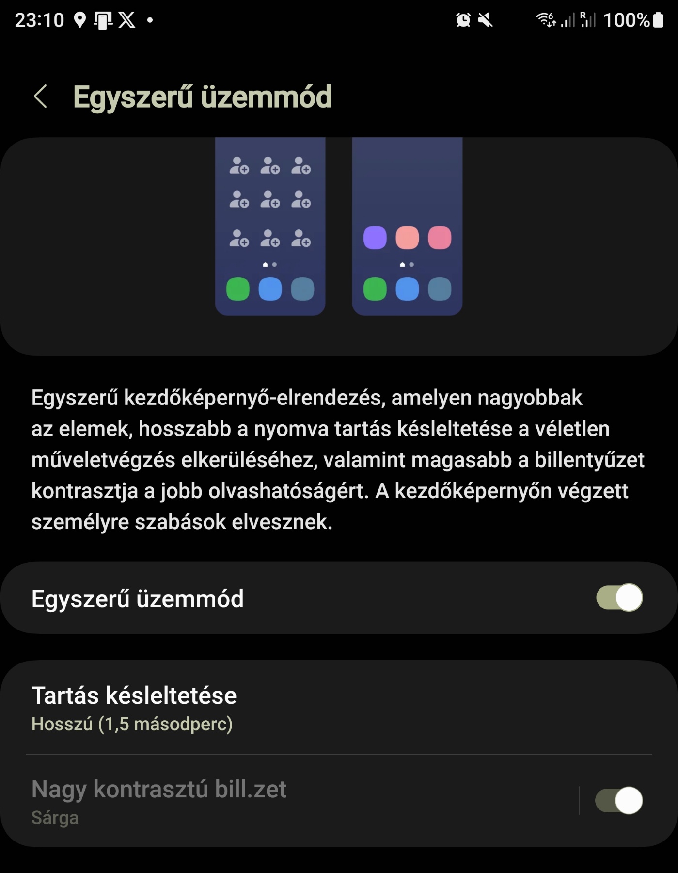 Példának okáért a SAMSUNG ONE UI 5 esetén az egyszerű mód bekapcsolásával növel az ikonok méretén, hosszabb a nyomvatartás késleltetése, magasabb a billentyűzet kontrasztja és kihelyezhetővé válnak egyszerűen a legfontosabb telefonszámok.