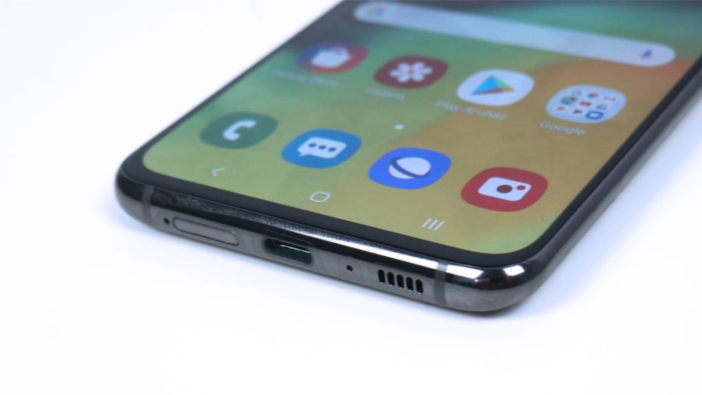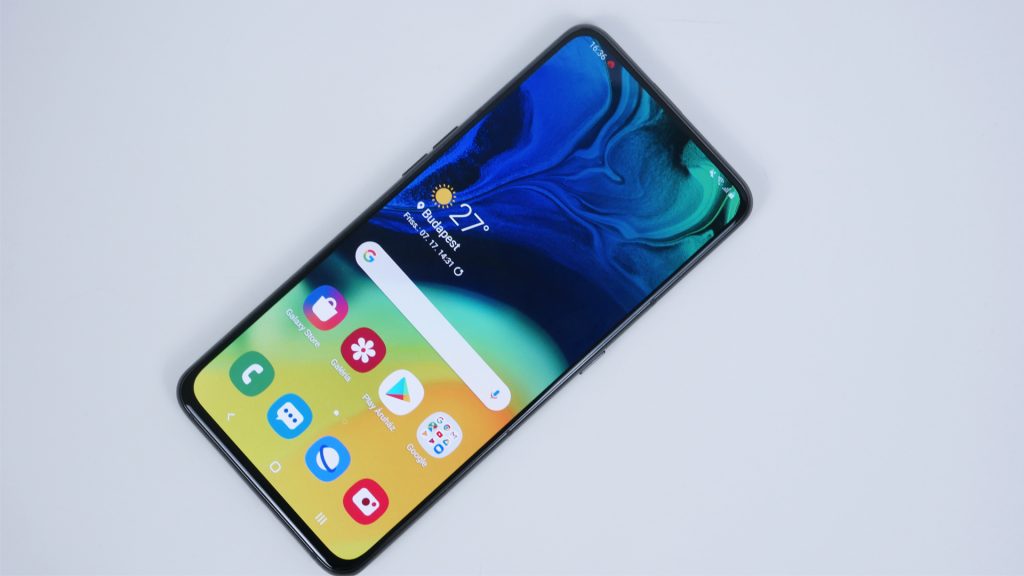 Eszköztár tekintetében kielégítő teljesítményt nyújt a Galaxy A80. Kezdve a Super AMOLED kapacitív érintőkijelzővel, ami 16 millió színt képes megjeleníteni a 6.7 inches, 20:9-es képarányú és 1080 x 2400 pixel felbontású, 393 ppi pixelsűrűségű panelen. Mivel felülről eltűnt minden, de maradtak oldalt és alul erősebb kávák, a kijelző az előlap 85.6%-át képes lefedni. A színei, lévén AMOLED panel, gyönyörűek és kellőképp kontrasztosak, a láthatóságába egyedül a nyári nap tud rajta kifogni, ha alacsonyabb fényerőre állítjuk a 611 nites kijelzőt. Van Always on display mód, ami a speciális kijelző-panel miatt ugye nem fogja megzabálni az akkunkat, illetve két koppintásos ébresztés is elérhető az ébresztéshez. Az A80 egyszem hangszórója jól muzsikál, zenehallgatáshoz, vagy videók nézegetéséhez – nem, nem fülhallgató nélkül egy nyilvános köztéren, hanem otthon, a négy fal között – tökéletesen ideális. A telefonon a lock gomb mellett „csak” hangerő-szabályozó gombokra lelünk, Bixby nem kapott dedikált gombot magának. Alul megtaláljuk a hangszórót, egy USB Type-C portot, valamint a SIM-nek szánt tálcát az antenna csíkok közt. Egy Dual SIM-es megoldást kapunk, viszont ahelyett hogy egy nagyobb méretű tálcával oldaná ezt meg a Samsung, egy sima nano-SIM tálcát kapunk, aminek egyik és másik oldalába tudjuk betenni a kis kártyákat. Hiába keressük, „háromésfeles” jack csatlakozót nem fogunk találni, ujjlenyomatolvasó viszont van, a kijelzőbe építve. Érezhetően lassabb, mint a Galaxy S10-é volt – lévén ez nem ultrahangos, hanem optikai felismerést használ -, de még bőven a jó kategóriában van, és talán így is gyorsabb, mint a PIN-kódot bepötyögni, vagy mintát rajzolni (arcfelismerés nincs). Közelségérzékelőt és állapotjelző LED-et nem kaptunk, a hívásnál használt piezoelektromos hangszóró pedig a kijelzőn átrezgő hanggal teszi hallhatóvá a hívásainkat. Az adatkommunikáció terén kaptunk egy kétsávos, 802.11 ac szabványú WiFi adó-vevőt, Bluetooth 5.0-ást, A-GPS-t Galileo és GLONASS támogatással. Ezen felül a tényező, hogy van NFC és FM Rádió, már csak cseresznye a hab tetején.