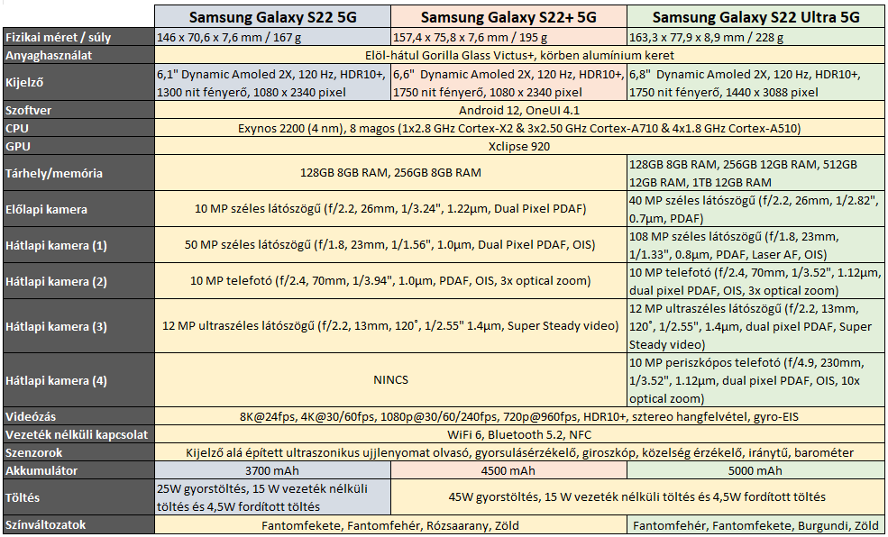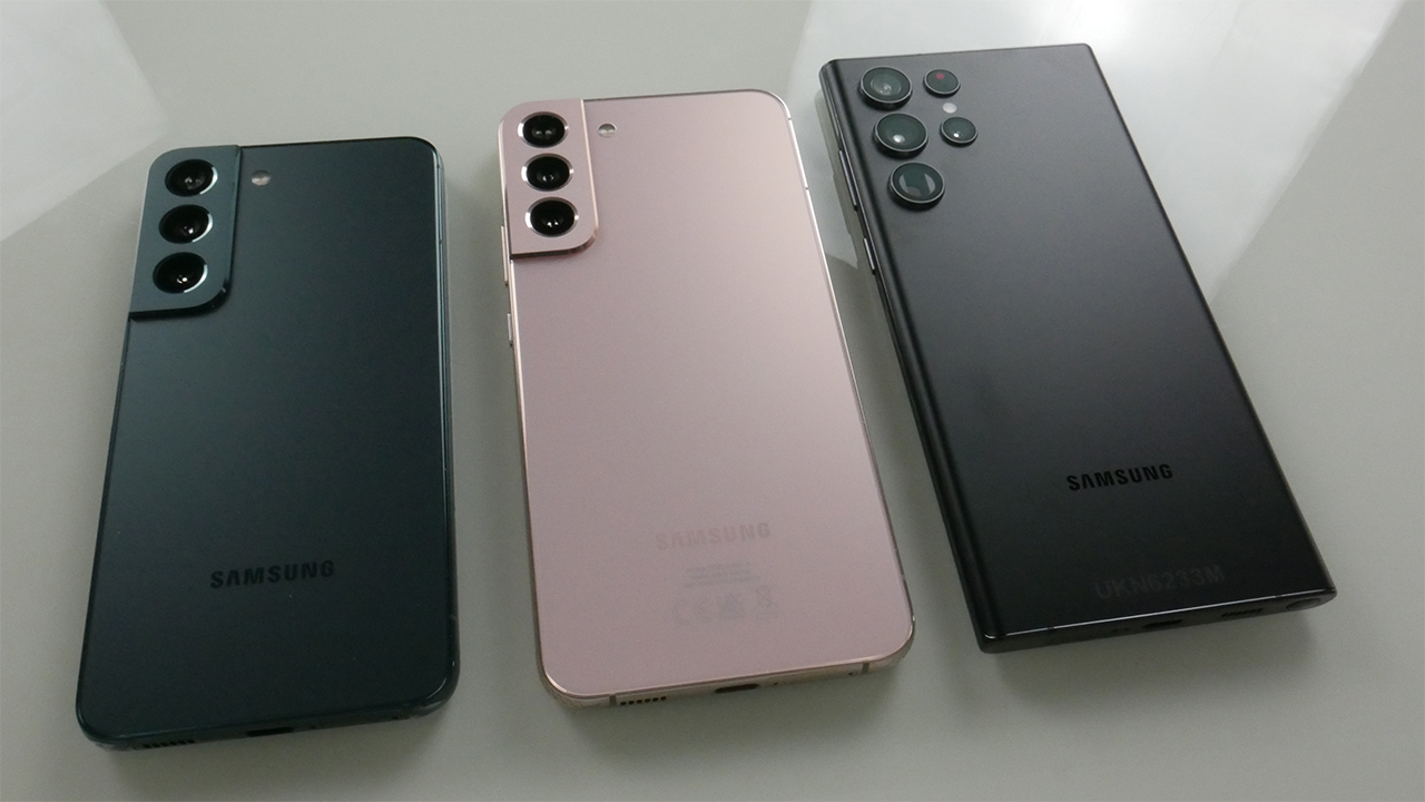 Az eltérés mindhárom modell esetében leginkább a fizikai méretben mutatkozik: a kijelző és akkumulátor méretben térnek el. Az S22 és S22+ kamerái megegyeznek, az Ultra minden kamerájával előrelépett, hiszen a szelfi kamera 40 MP-es a másik két modell 10MP-es széles látószögű kamerájával szemben, illetve a hátlapiak is komolyabbak. Kapott egy negyedik kamerát, ami a már meglévő telefotó lencse mellé egy periszkópos telefotó kamera.