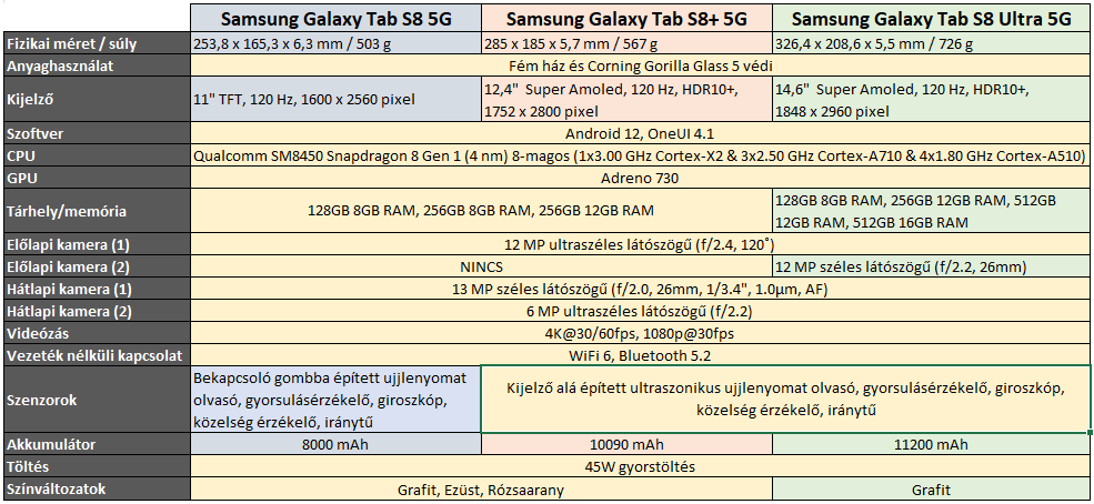 Nézzük, hogy mik a hasonlóságok és különbségek a Tab S8 tagjai között: