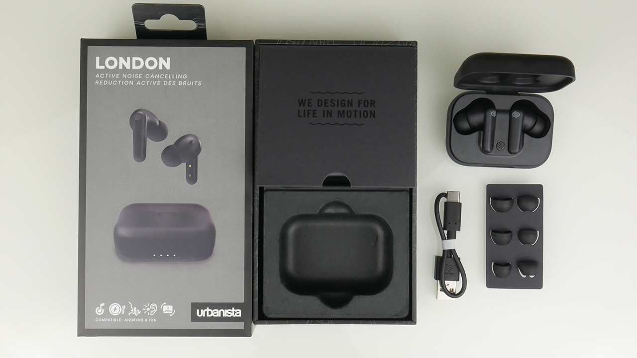 Az Urbanista London egy apró, True Wireless fülhallgató. Doboza a kézikönyvön kívül 3 pár (S, M, L méretű) gumiharangot és egy töltőkábelt tartalmaz. Maga a fülhallgató egyszerű, műanyag töltő bölcsőben van, ami Type-C csatlakozóval tölthető a hátulján vagy akár vezeték nélküli töltéssel bármely Qi töltővel vagy fordított töltést támogató telefonnal. Töltöttségét az elején látható 4 LED jelzi. Az Urbanista London 7,5 óra zenehallgatási idővel rendelkezik, de a töltő tok még további 3 alkalommal képes feltölteni, így összesen 30 órányi zenehallgatásra elegendő.