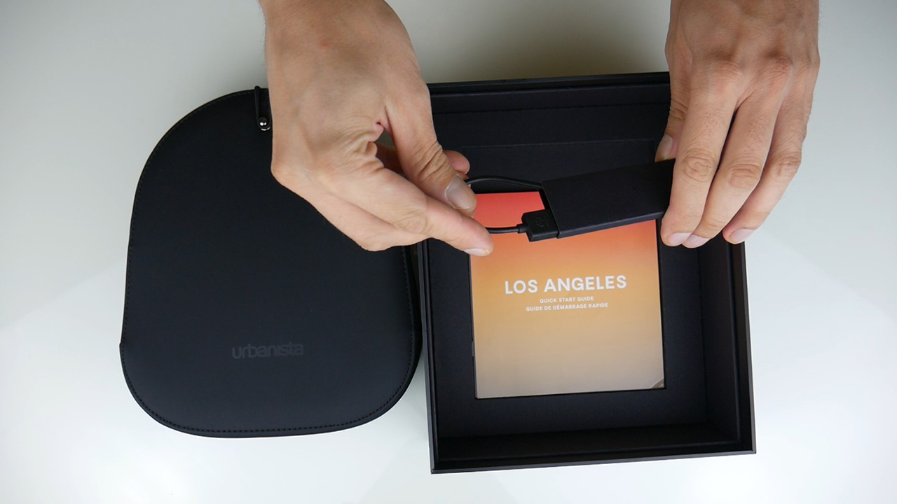 Az Urbanista Los Angeles doboza a legnagyobb: a belsejében újabb doboz fogadott és egy papír arról a tényről, miért is olyan különleges ez a fejhallgató. A különlegessége pedig az, hogy a fejpántjába napelem van építve, így a szabadban mászkálva töltődik az akkumulátora. Az ötlet zseniális, hiszen a napelemnek nincs feltétlenül szüksége direkt napfényre. Ha borús az ég, akkor is képes tölteni, ugyan csak kisebb hatékonysággal. Dobozában a kézikönyvön kívül csupán egy Type-C töltőkábelt találunk, a fejhallgató pedig egy nagyon igényes műbőr tokban van, aminek a tetején a fejpánt kilátszik, így tokba helyezve is képes töltést felvenni.