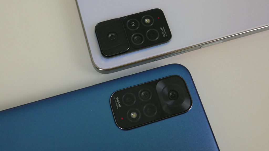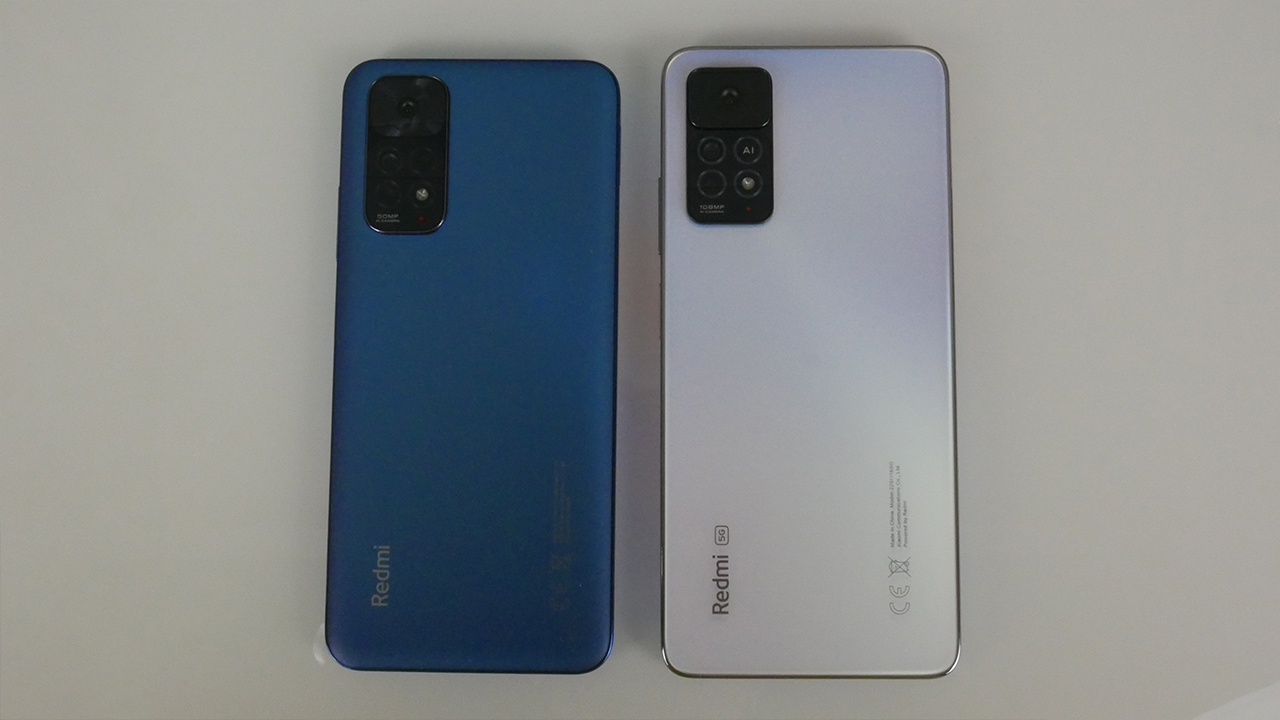 A hátlapon a hasonló kameraszigetek fedezhetőek fel. A Pro modellen egy kamerával kevesebb van és a 105MP-es főkamera kiemelkedik a sziget síkjából. A Note 11 műanyag hátlapjával szemben a Pro 5G már üveget kapott.