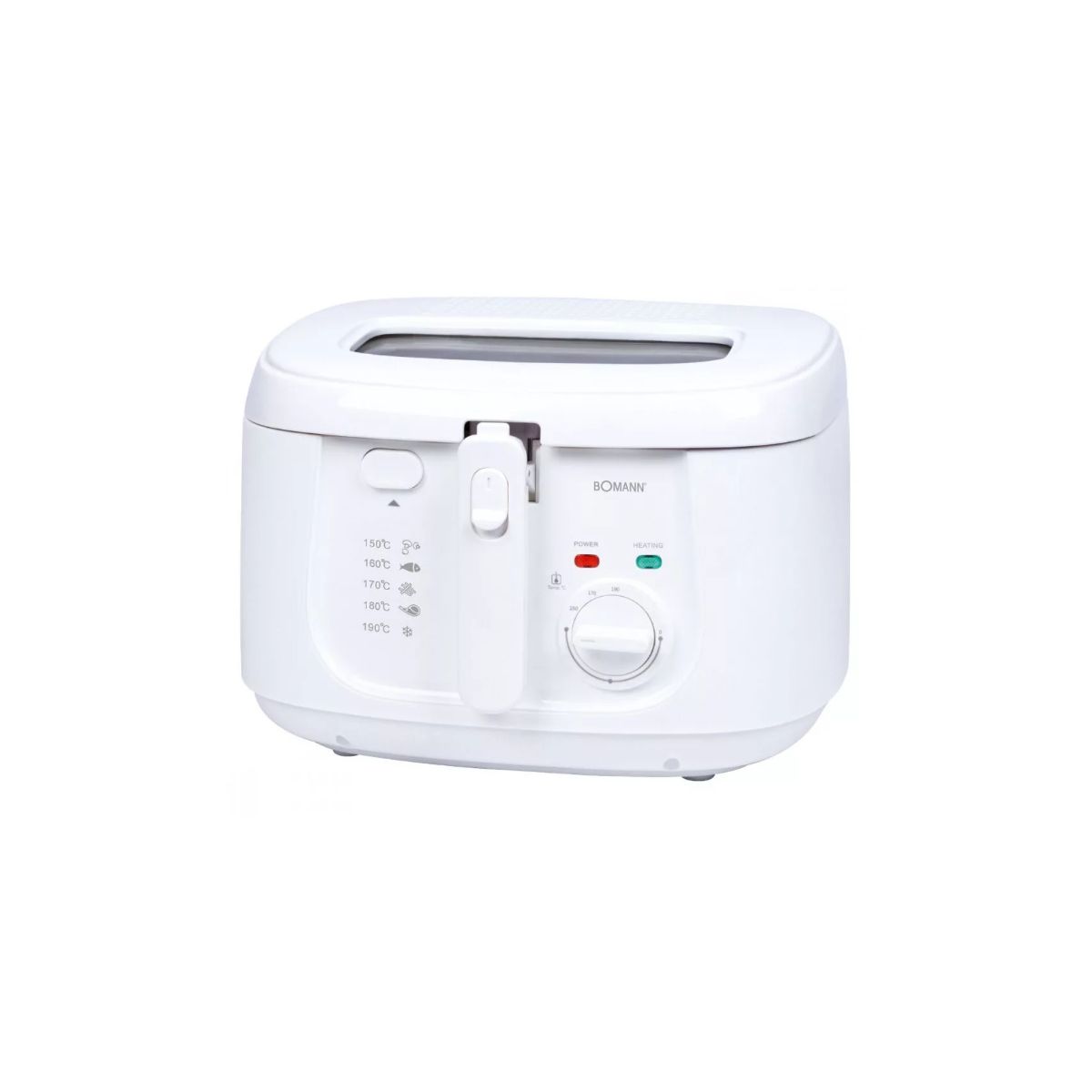 Bomann FR 6051 CB olajsütő • Teljesítmény: 1000 W • Űrtartalom: kb. 2,5 liter olaj/sütőzsír • Fokozatmentesen állítható termosztát jelzőfénnyel (130–190 °C) • Szag- és füstszűrő • Hűvös ház • Olajtartály (tapadásmentes bevonattal) • Felugró fedél a nézőablakkal (levehető) • 2 jelzőfény a hőmérséklethez és a működéshez • 2 hordozó/fogantyú mélyedés• Garancia: 24 hónap