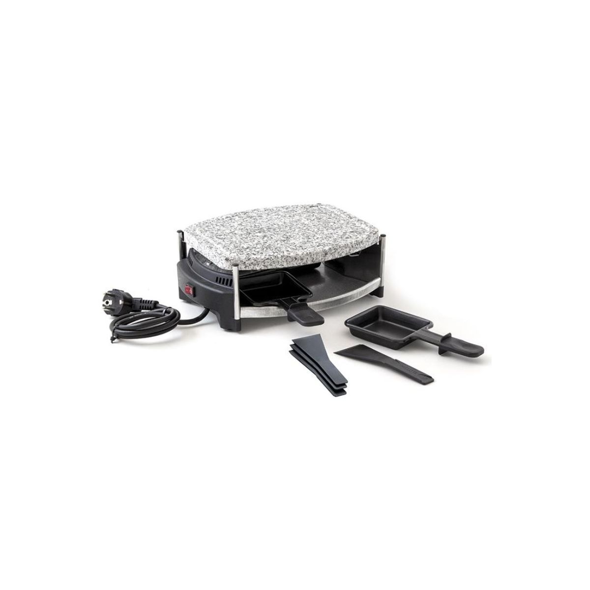 Eva 022758 raclette grill sütő • 500W teljesítmény • Kőlap • 4 db raclette lap • A raclette lap fogója hőszigetelt • Muködést jelző fény • Méretek: 205 x 220 x 200 mm• Garancia: 12 hónap