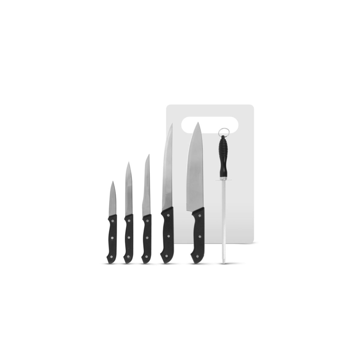 Family konyhai késkészlet élezővel • Rozsdamentes acél pengék • Öt méretű kés • Szegecselt markolat • Élezővel, vágódeszkával • Könnyen tisztítható • Kés pengehossz: 80 / 120 / 140 / 200 / 200 mm • Kések anyag: Rozsdamentes acél / műanyag • Vágódeszka mérete: 290 x 195 x 3 mm • Vágódeszka anyaga: Műanyag • Mosogatógépbe rakható: Nem
