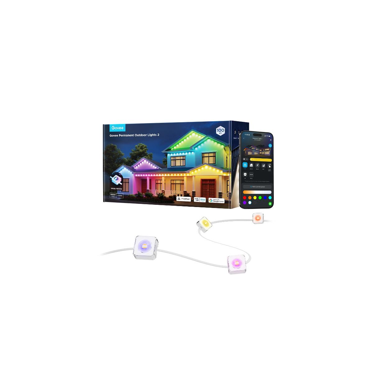 Színek: RGBICW • Hosszúság: 30m • Vízálló: Kültéri lámpák: IP67; Hálózati adapter: IP65; Vezérlődoboz: IP65 • Fényforrások száma: 72 • Lumen: 40 lumen fényforrásonként • Vágható: × • Matter: ✓ • Jelenet mód:100 • Adapter: 36V 2A • AIGC: ✓• Garancia: 24 hónap