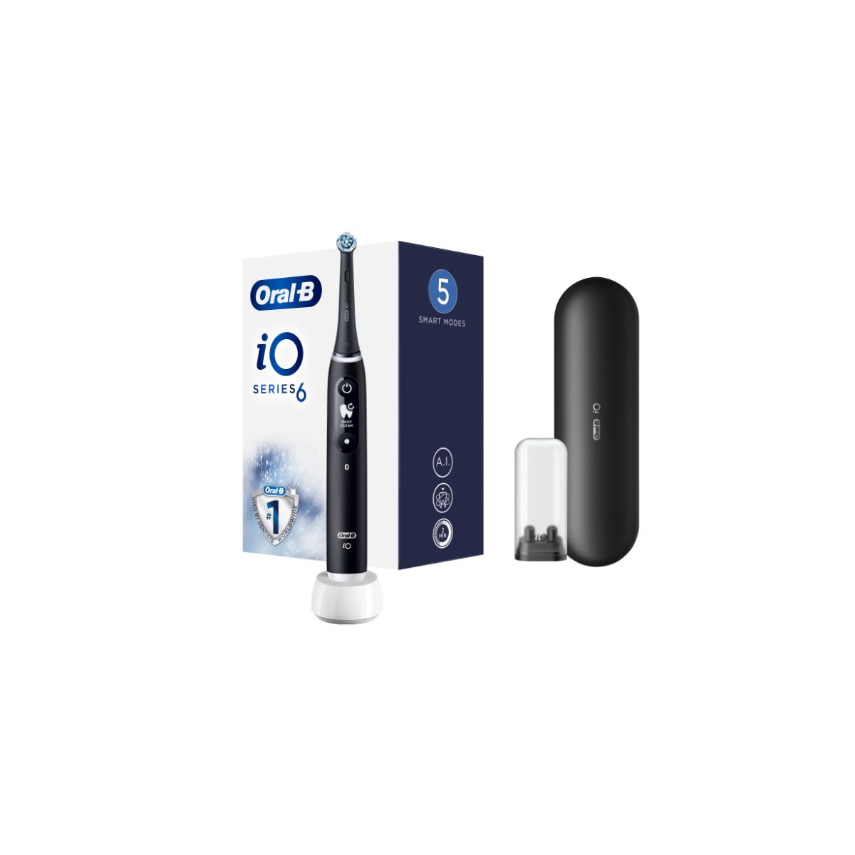 Oral-B iO Series 6 elektromos fogkefe • Interaktív, fekete-fehér kijelző • Mesterséges intelligenciára épülő technológia • Bluetooth® csatlakozás • 5-féle intelligens fogmosási üzemmód • Intelligens nyomásérzékelő • Töltő • Utazótok