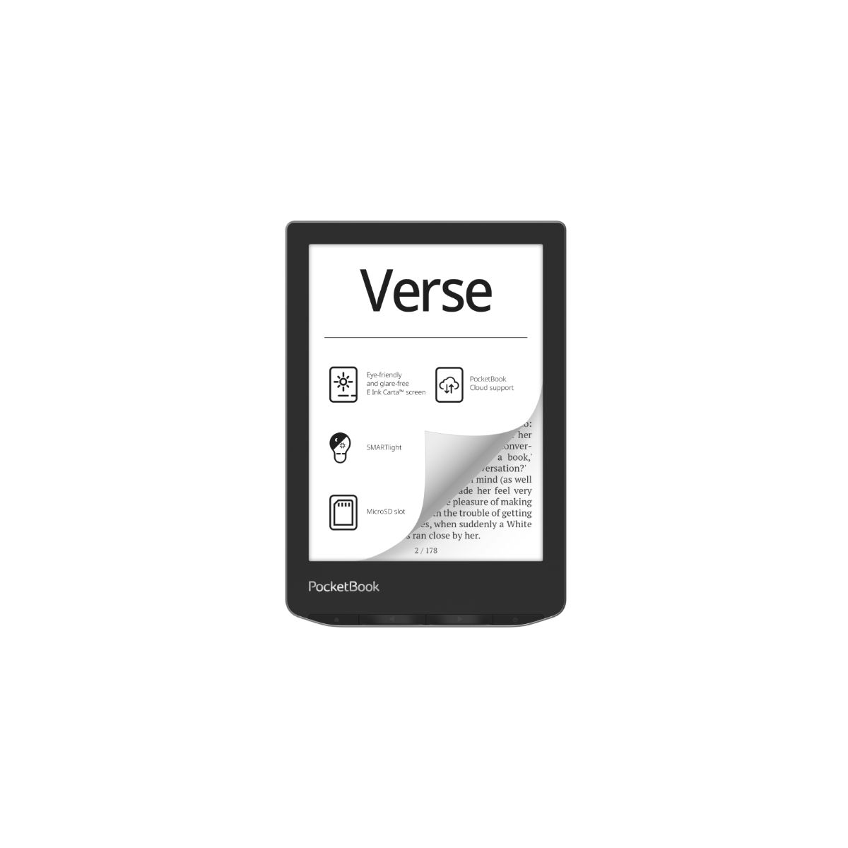 PocketBook Verse e-book olvasó • Belső tárhely: 8 GB • Kijelző: 6" 758 x 1024 pixel, 16 szürkeárnyalatú E-Ink Carta™ érintőkijelző • 25 könyv- és grafikai formátum támogatása átalakítás nélkül • Ingyenes szótárak • Operációs rendszer: Linux 3.10.65 • Csatlakozók: USB-C • WLAN: Igen • Memóriakártya típusa: microSD • Processzor: Kétmagos (2×1 GHz) • Memóriaméret: 512 MB • Akkumulátor típusa: Li-ion Polimer (1500mAh)• Garancia: 24 hónap