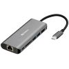 Sandberg dokkoló állomás • Csatlakozás PC-hez: USB-C • Portok: HDMI (1db), VGA (1db), USB3.0 (3db), RJ45 gigabites LAN (1db), SD-kártya olvasó, microSD kártyaolvasó, 3.5mm jack audio (1db), USB-C tápbemenet (1db) • HDMI max felbontás: 4K/UHD (30Hz), FullHD (60Hz) • Aluminium ház