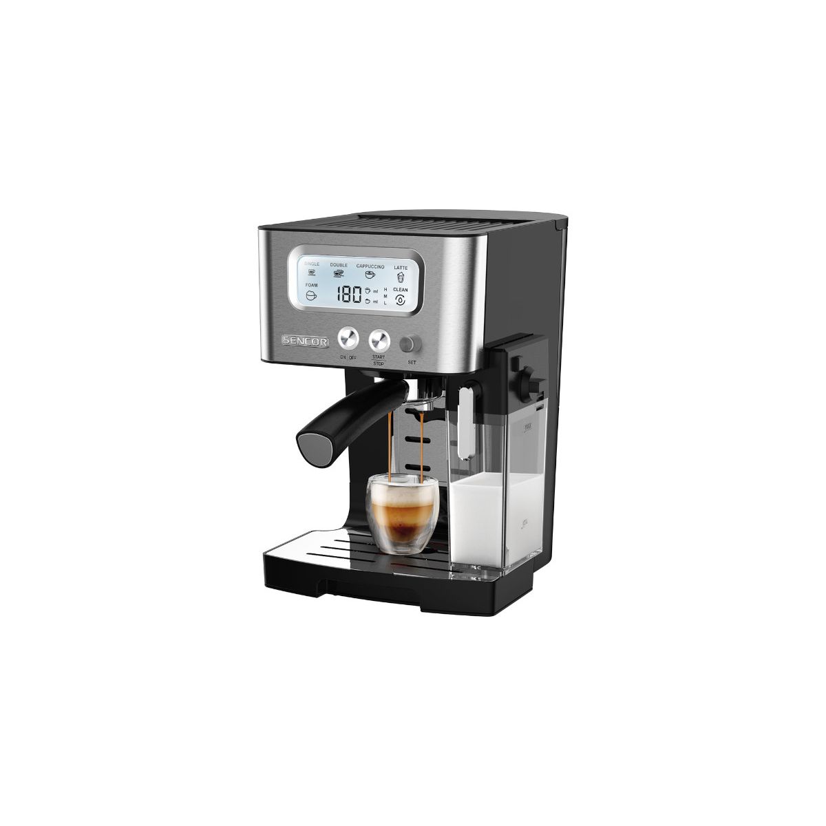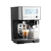 Félautomata kávéfőző 1450 W teljesítménnyel • Nagyméretű LCD panel • 15 bar nyomás a kitűnő kávéhoz • Bojler, Thermoblock fűtőrendszerrel • Nagyon gyors előmelegítés • Előforrázás az intenzívebb ízekhez • Espresso, Double Espresso, Cappuccino, Latté és Tejhabosítás program indítás egy érintéssel • Átlátszó tejtároló edény, kivehető habosító rendszerrel, egyszerűen tisztítható • Rozsdamentes szűrő, 1 vagy 2 csésze kávéhoz • Fűtött csészetartó • Csészeméret memória • Elektronikus vezérlőegység és hőmérséklet szenzor az ital pontos hőmérsékletéhez • Rozsdamentes acél fedél a kis Espresso csészékhez • Automatikus öntisztító funkció • Levehető, könnyen tisztítható cseppgyűjtő tálca • Extra hely a nagy csészéknek • Kivehető, 1,4 l-es víztartály, garantálja a friss és tiszta vizet a finom kávéhoz • Vízmennyiség kijelző • Figyelmeztetés vízkő eltávolítás végrehajtására • Vízkő eltávolító funkció • Világító kapcsoló • Csúszásgátló lábak • Tartozékok: szűrőtartó, kávé mérőkanál, 2 szűrő (1 vagy 2 csésze kávéhoz) • Zajszint max. 70 dB • Hálózati vezeték hossza: 95 cm • Méret (szélesség × mélység × magasság): 309 × 249 × 355 • Tömeg: 4,3 kg • Feszültség és frekvencia: 220-240 V, 50 Hz• Garancia: 24 hónap
