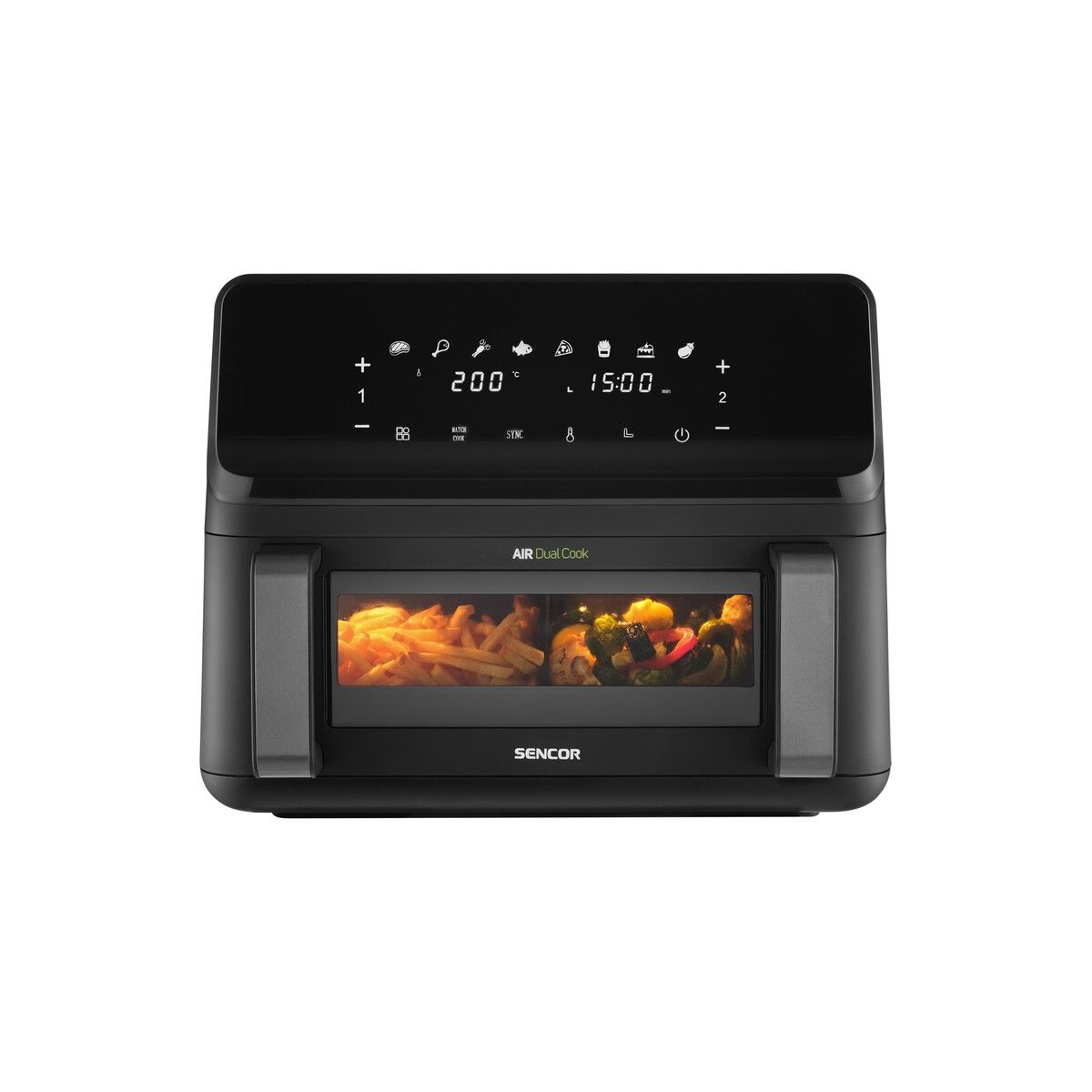 Sencor SFR 9650BK forrólevegős fritőz • 2700 W teljesítmény • 9 literes űrtartalom • Digitális kijelző 80-200 °C hőmérsékletbeállítással • 8 előre programozott funkció • SyncFinish funkció a párhuzamos sütéshez• Garancia: 24 hónap