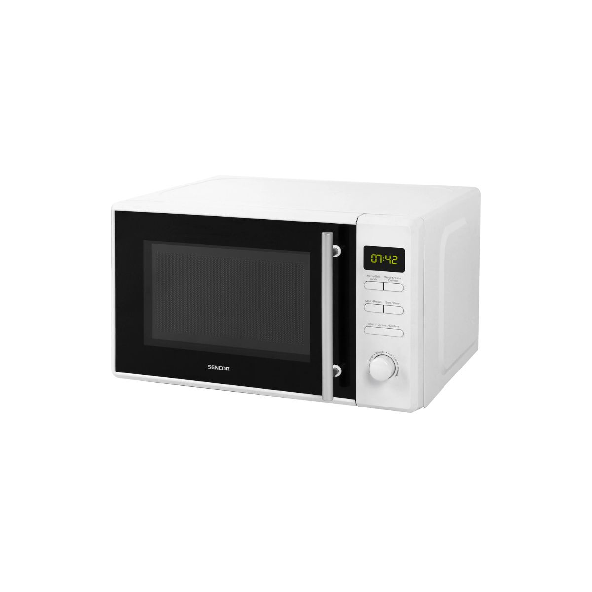 Sencor SMW 4220WH mikrohullámú sütő • Termékszín: Fehér • 700 W mikrohullámú teljesítmény • 1000 W grill teljesítmény • 20 literes kapacitás • 35 perces időzítő • 255 mm átmérőjű forgótányér • Könnyű tisztítás rozsdamentes acél kivitelben • Alacsony zajszint (60 dB) • Gyermekzár funkció