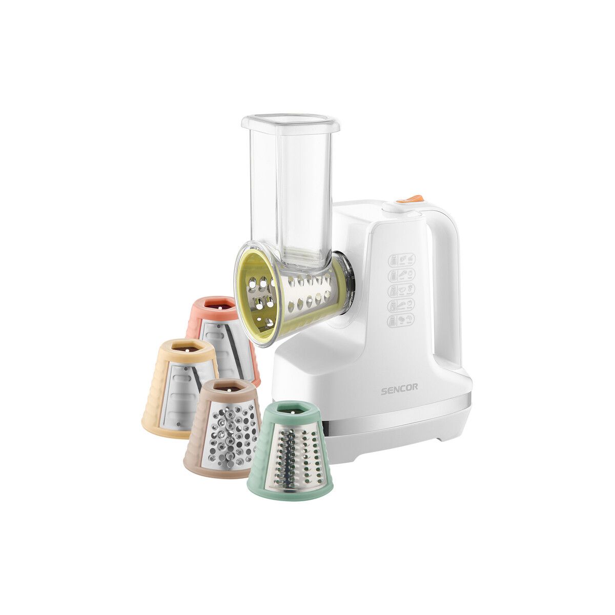 Sencor SSG 4500WH elektromos szeletelő • Speciális zöldség-gyümölcs szeletelő, reszelő, aprító • Akár fagylalt is készíthető • 5 darab cserélhető szeletelő tartozék: vékony szeletelő, hullámos szeletelő, durva reszelő, finom reszelő, nagyon finomreszelő • Teljesítmény: 150W
