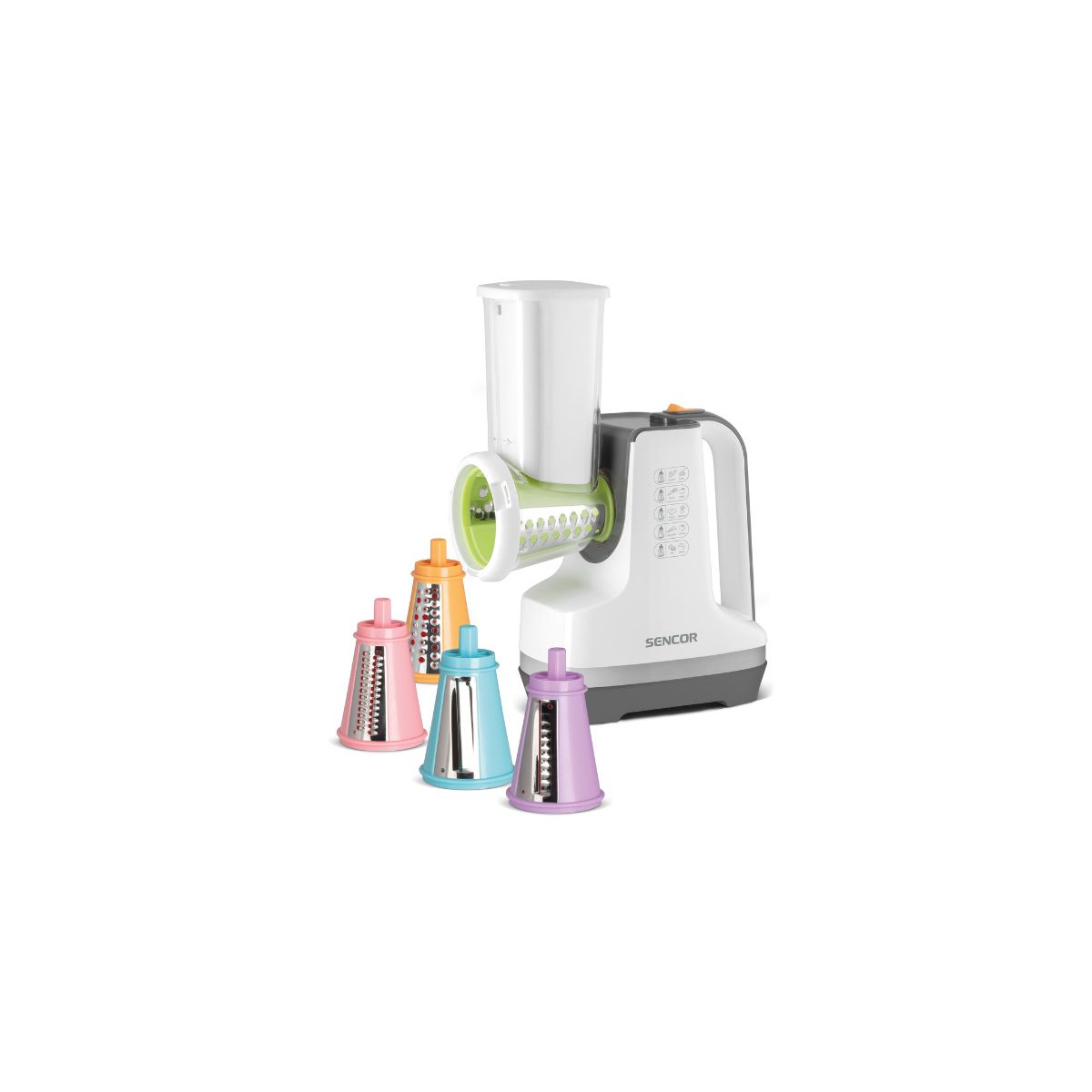 Sencor SSG 4500WH elektromos szeletelő • Speciális zöldség-gyümölcs szeletelő, reszelő, aprító • Akár fagylalt is készíthető • 5 darab cserélhető szeletelő tartozék: vékony szeletelő, hullámos szeletelő, durva reszelő, finom reszelő, nagyon finomreszelő • Teljesítmény: 150W• Garancia: 24 hónap