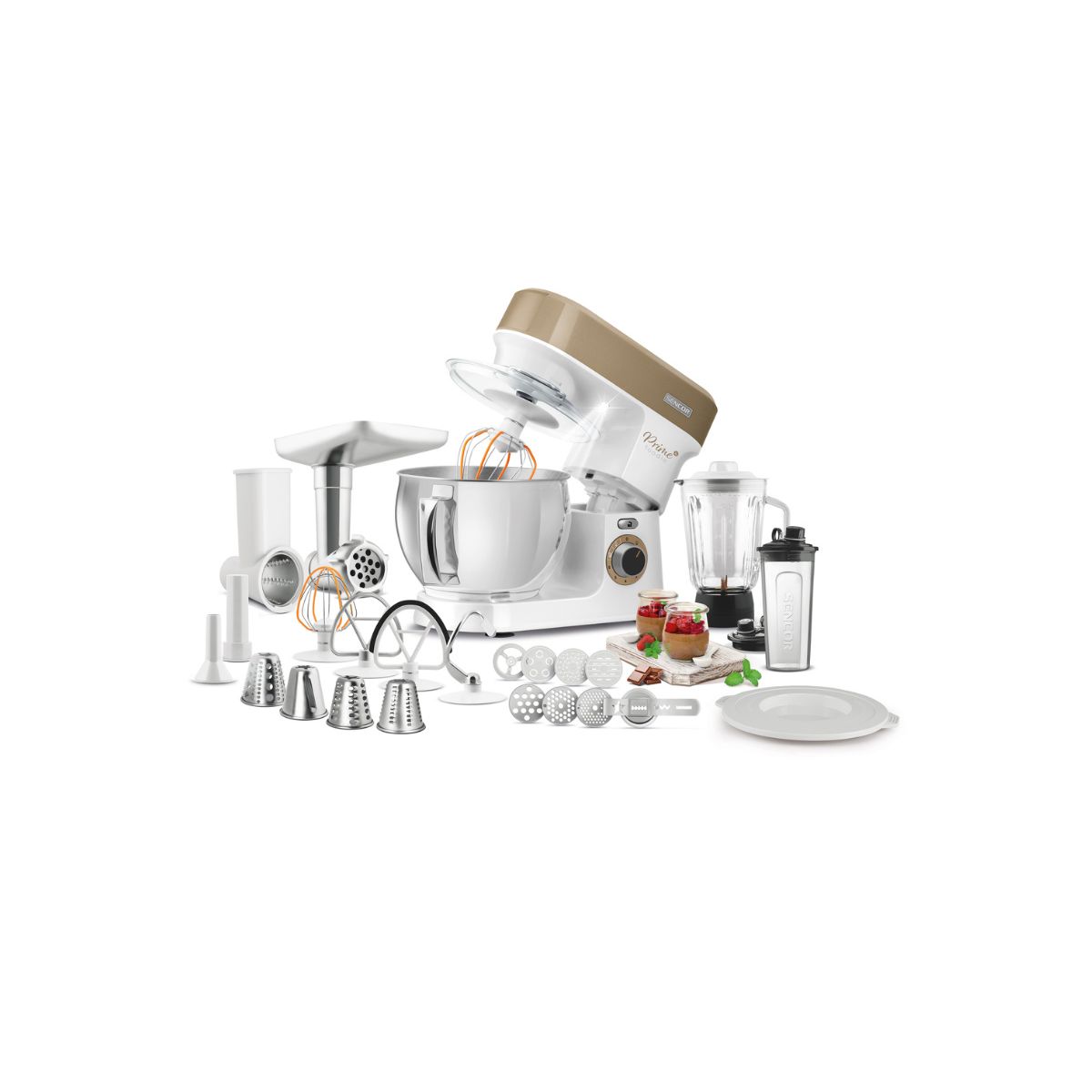 Akár 1200 W elérhető teljesítmény • Akár 2,7 l könnyű és 0,8 kg kelt tészta is készíthető • 5,0 literes rozsdamentes acéledény • 4 különböző cserélhető tartozék • Bolygóműves keverési rendszer • Bajonett-rendszerű tartozékrögzítés • 6 különböző fordulatszám • Impulzus üzemmód • Titán bevonatú kések • 2 NutriSmart program • Beépített LED világítás • Felhajtható kar a kényelmesebb munkavégzéshez, tartozékok cseréjéhez • Egyszerűen tisztítható (a rozsdamentes edény mosogatógépben is elmosható) • Hálózati vezeték tároló • Csúszásmentes lábak garantálják a készülék biztonságos használatát • Több biztonsági funkcióval ellátva • Tartozékok: Dagasztó, A-alakú keverőszár, Ballon alakú habverő, Fröccsenésgátló mágneses fedél, 1,5 l-es üvegedény, Húsdaráló, Kolbásztöltő feltét, 3 tésztakészítő feltét, Daráltkeksz készítő, Kiváló minőségű és kényelmesen használható 0,6 l-es smoothie edény, Nutridrink mixer NutriBlender tartozékokkal, és kényelmes használatú ivópohárral, Szeletelő és reszelő • 4 rozsdamentes tartozék: hullám alak szeletelő, durva reszelő / daráló, finom reszelő / daráló, keménysajt és diódaráló • Technikai információk: Feszültség és frekvencia: 220-240 V, 50/60 Hz• Garancia: 24 hónap