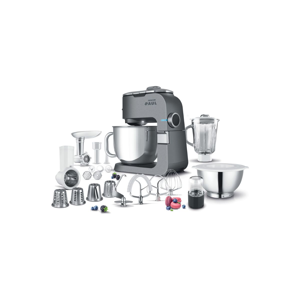 Sencor STM 7970 PAUL 1 konyhai robotgép • 1700 W teljesítmény • 6,5 és 6 literes rozsdamentes acél keverőtálak • 1,5 literes üvegmixer • három keverőszár: dagasztókar, habverő, keverőszár • Smart Power & Energy technológia