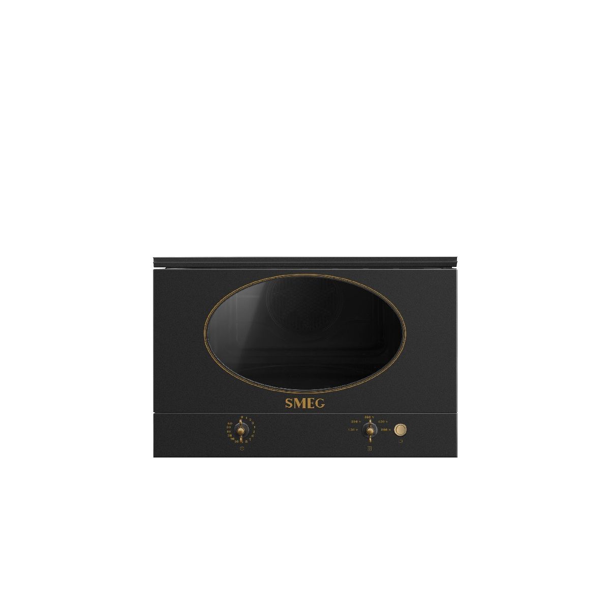 SMEG MP722PO beépíthető mikrohullámú sütő • 23 literes nettó térfogat • 850 W mikrohullámú teljesítmény • 1250 W grill teljesítmény • Elektronikus vezérlés • Antik sárgaréz felületkezelés