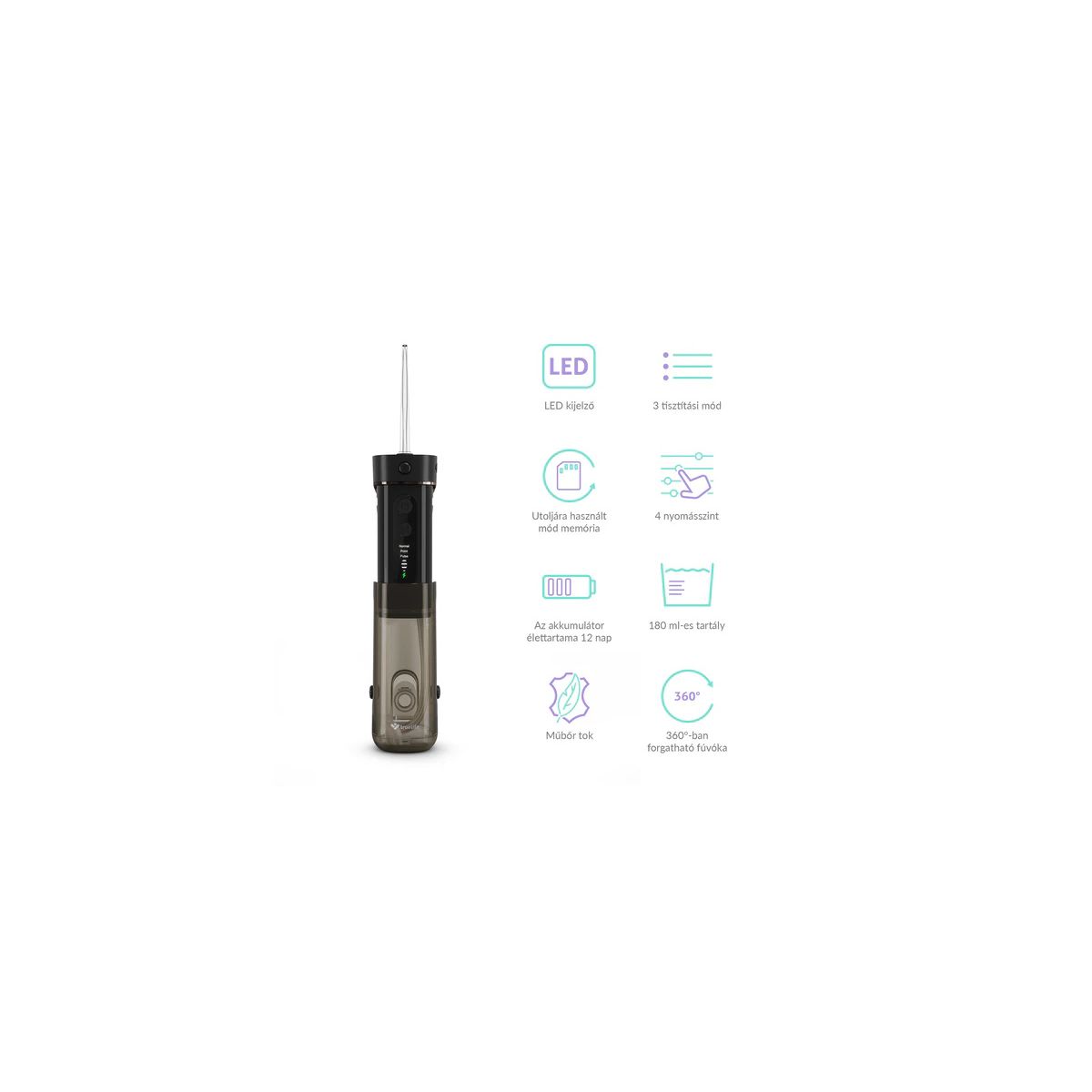 Orális zuhany a fogak közötti gyengéd tisztításhoz, 3 tisztítási mód, 300 ml-es tartály, rendkívül gyors feltöltés felülről és oldalról, újratölthető - 14 nap egy töltéssel, kompakt kialakítás, kijelző, memória, időzítő, 6 fúvóka a csomagban, IPX7 védelem